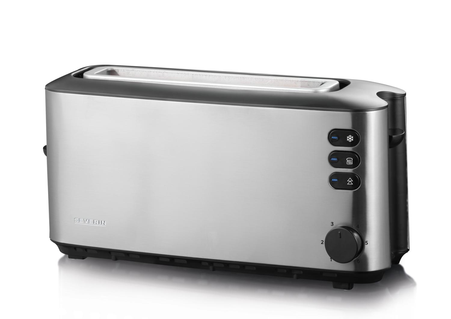 Snygg rostfri brödrost med extra lång öppning för rostning av större brödskivor.