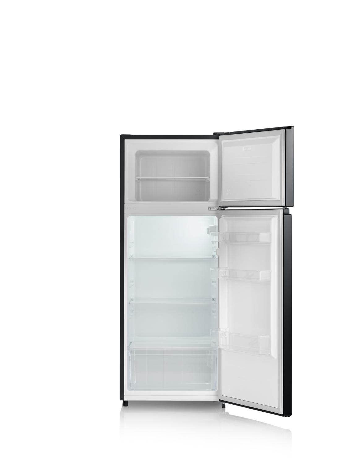 Kyl&frys med frysen upptill är en praktisk och energieffektiv lösning för ditt kök. Detta skåp har energiklass E och erbjuder en kapacitet på 164 liter för kyl och 41 liter för frys. Med en höjd på 144 cm och en bredd på endast 55 cm passar det perfekt även i mindre utrymmen. Dess fräcka svarta design ger en härlig touch till ditt kök.