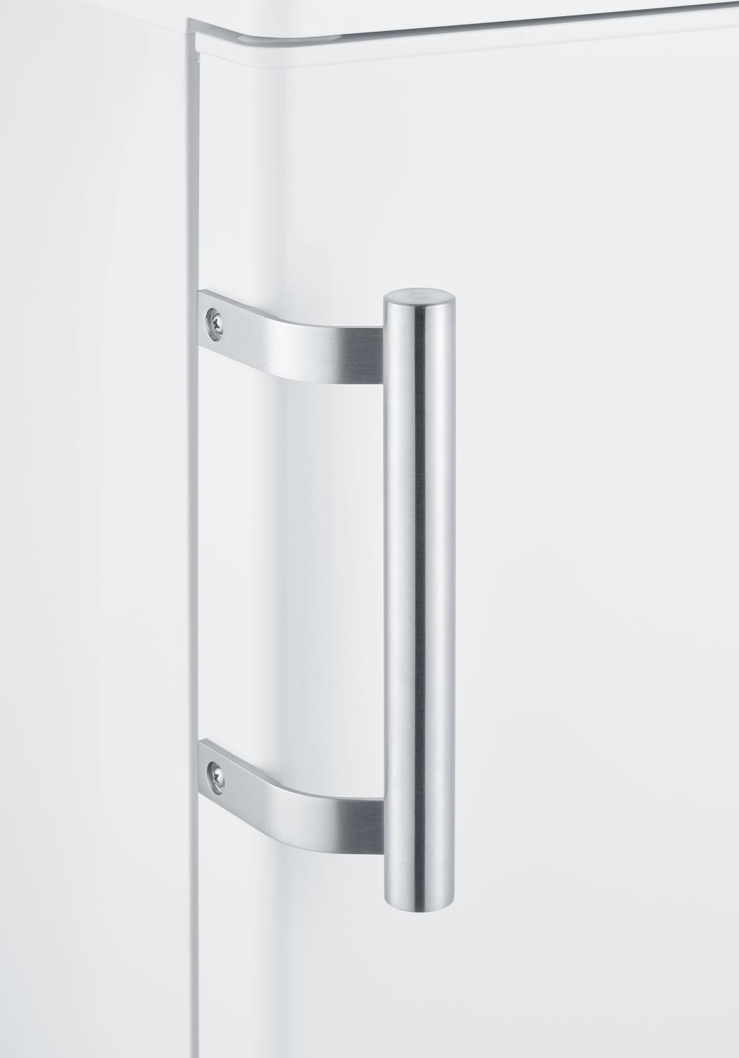 Kylskåpet är utrustat med en effektiv LED-belysning som ger bra översikt och en rejäl grönsakslåda för att hålla frukt och grönsaker färska längre. Dörren är smakfullt designad med ett snyggt rostfritt handtag som ger en elegant touch till köket. Glas hyllorna är förstärkta med kromade kantlister för extra stabilitet och stil.