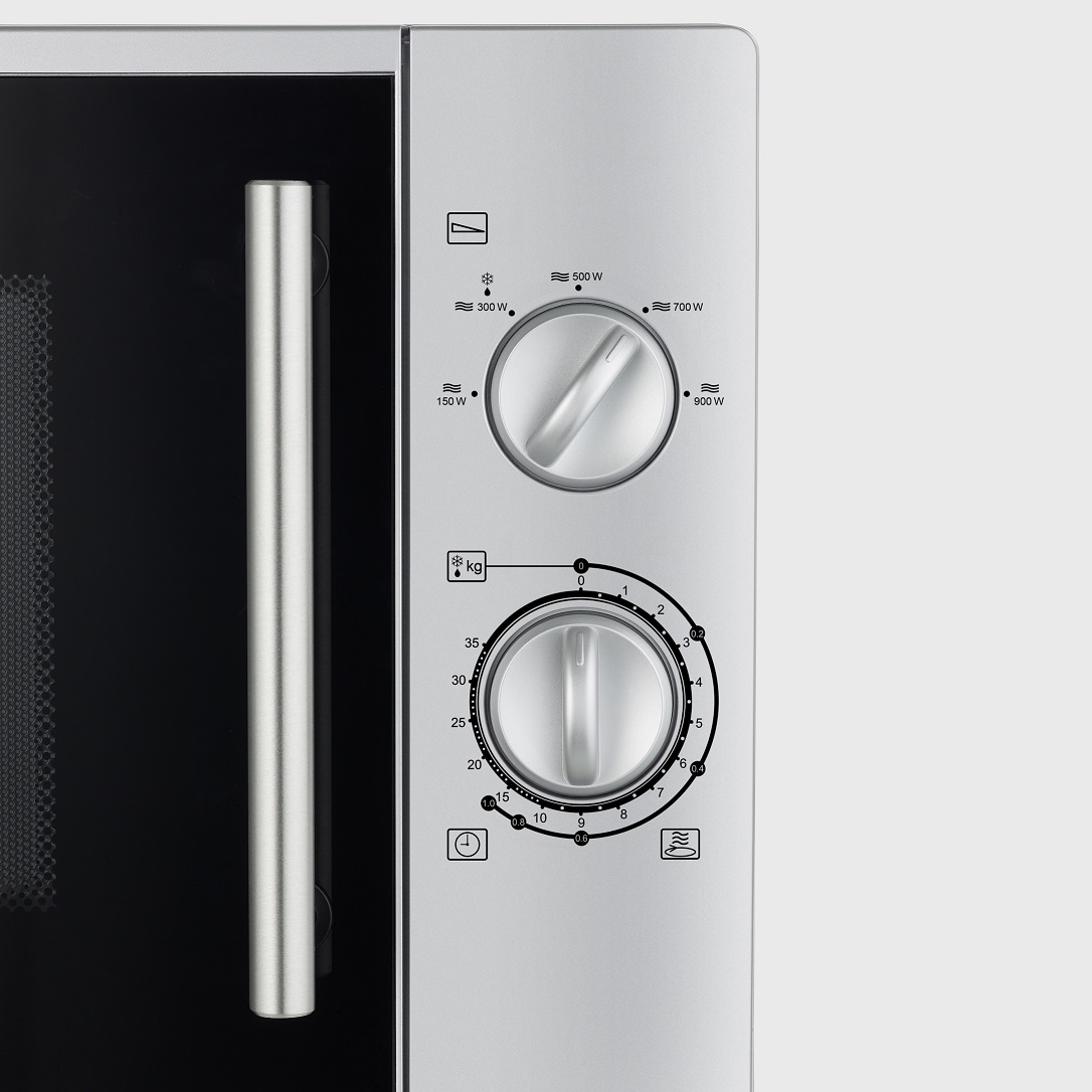 Mikrovågsugnen med en kapacitet på 28 liter är både rymlig och praktisk. Den är utrustad med ett bekvämt handtag som underlättar öppnandet och stängandet av dörren. Med tydliga vred kan du enkelt justera effektläget och tiden för optimal användarvänlighet.