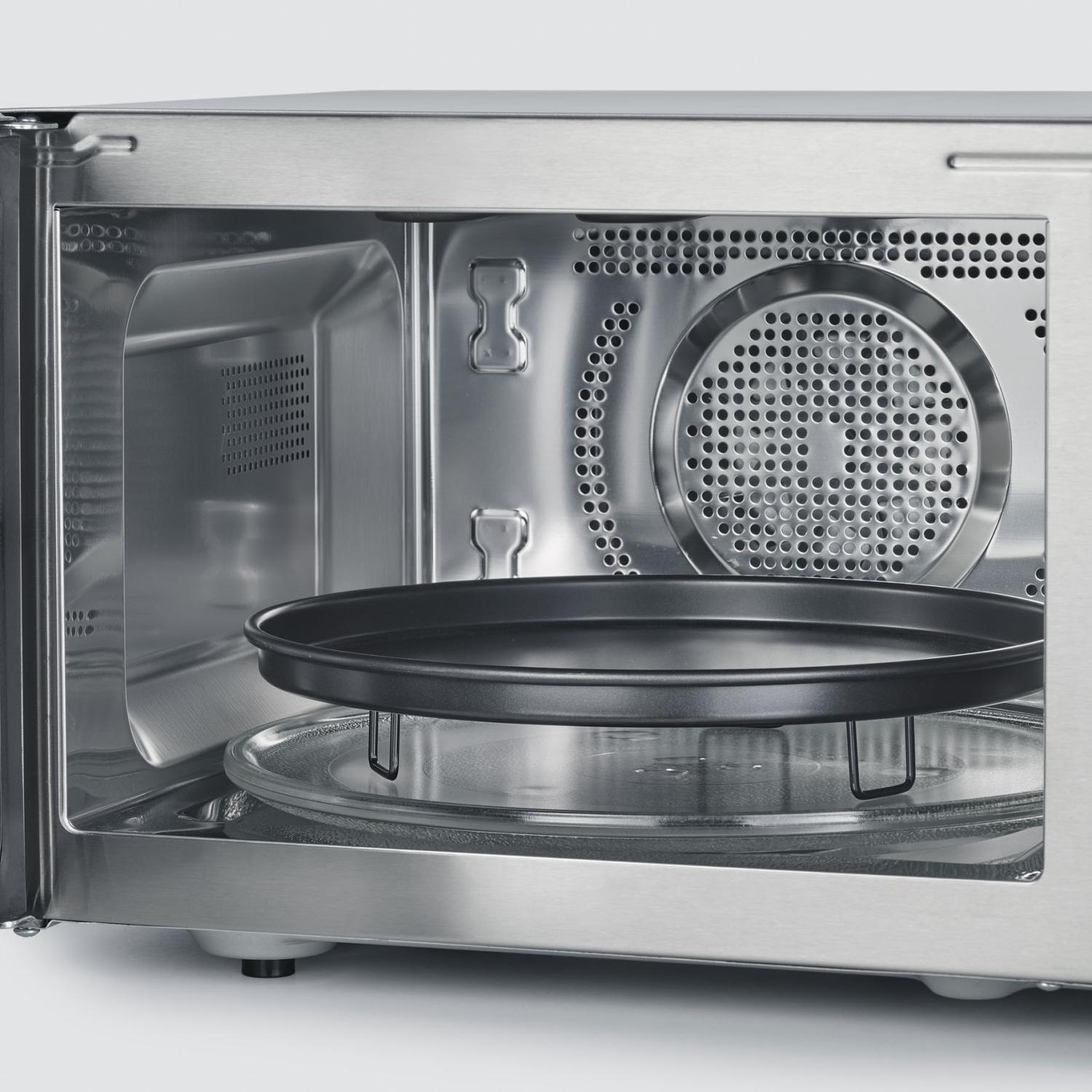 Dessutom ingår en non-stick belagd pizzatallrik i den här modellen, vilket gör att du kan tillaga vilken fryspizza som helst och få en knaprig och god yta. Mikrovågsugnen är också utrustad med grilleffekt, vilket ger dig möjlighet att få den knapriga ytan som du älskar.