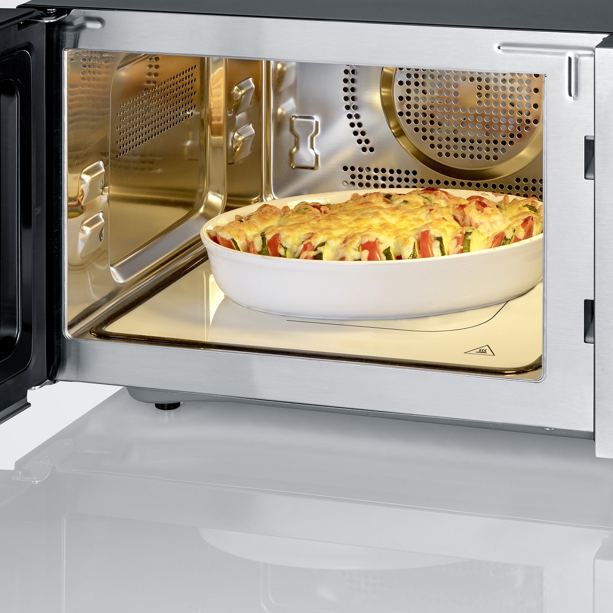 Den stilrena rostfria mikron är en perfekt passform för alla kök med sin eleganta design. Den imponerar med en tydlig LED-display och sensorknappar samt en kraftfull effekt på 900W som ger en extra touch till ditt kök. Med en generös volym på 25 liter är den idealisk för dem som behöver lite extra utrymme. En unik egenskap hos denna mikrovågsugn är dess glaskeramiska botten som möjliggör användning av rektangulära ugnsformar utan behov av en roterande glasbricka, vilket ökar kapaciteten med hela 80%.